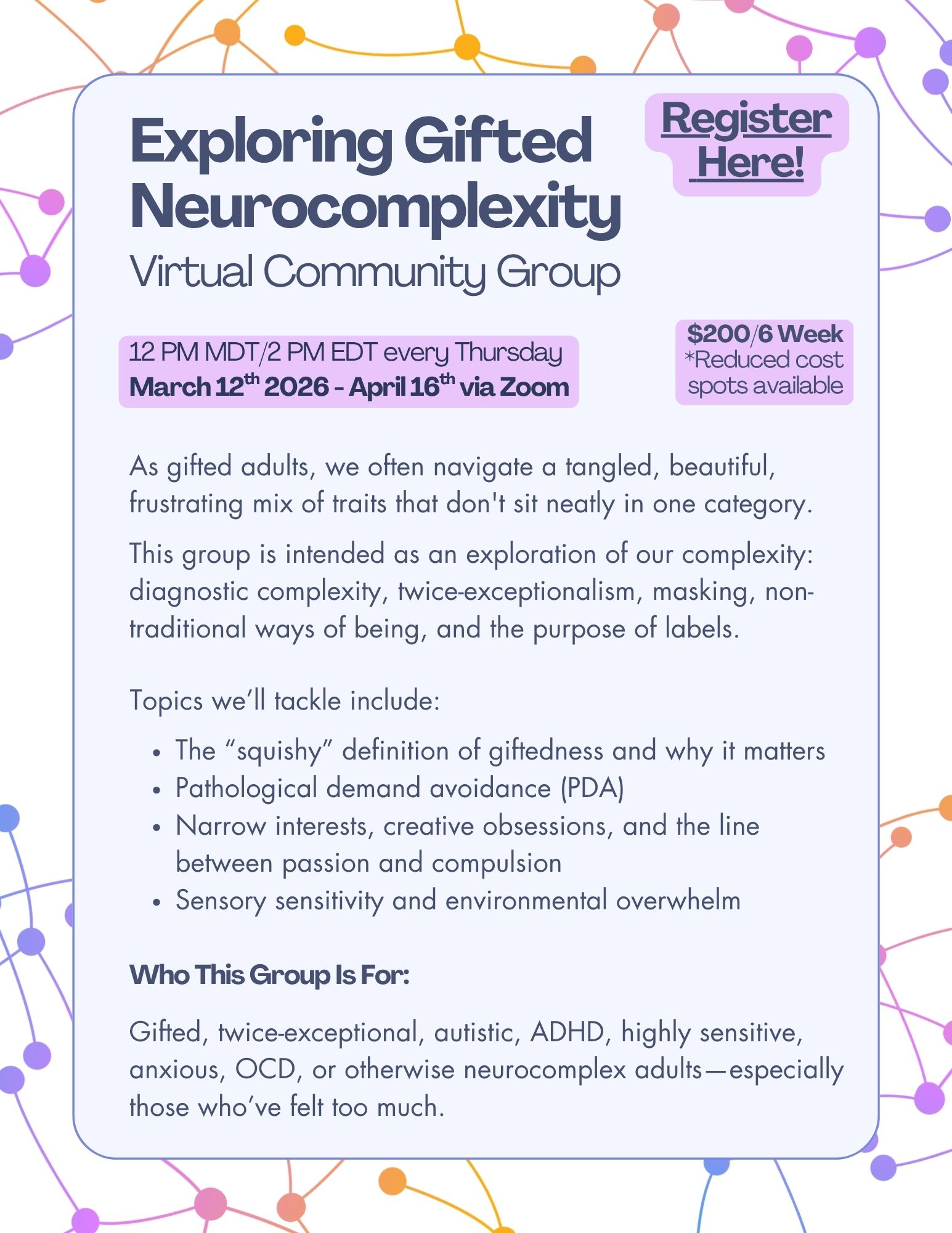 As gifted adults, we often navigate a tangled, beautiful, frustrating mis of traits that don’t sit neatly in one category. This group is intended as an exploration of that complexity.